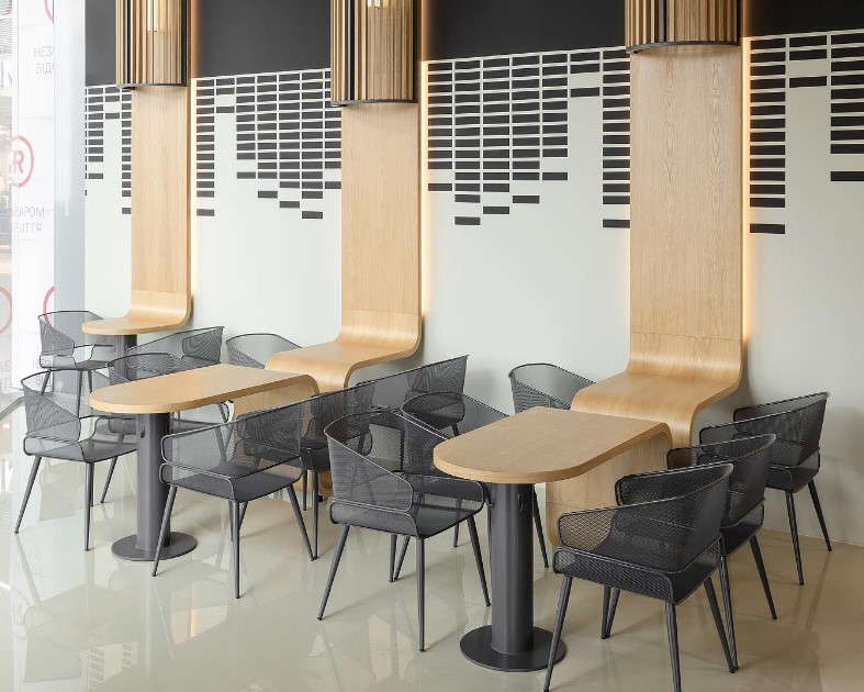 در بعضی طراحیها، ترکیب چوب با فلز باعث میشود هم ظاهر مدرنتر شود و هم استحکام میز و صندلی افزایش پیدا کند. استفاده از صندلی فلزی با نشیمن چوبی، برای کافیشاپهایی که مشتریان زیادی دارند یا صندلیها مرتب جابهجا میشوند، گزینهای کاربردی است. پایههای فلزی با رنگهای مقاوم و صفحههای چوبی طبیعی، ترکیبی هستند که هم دوام دارند و هم با نور طبیعی و فضای داخلی کافه هماهنگ میشوند.
